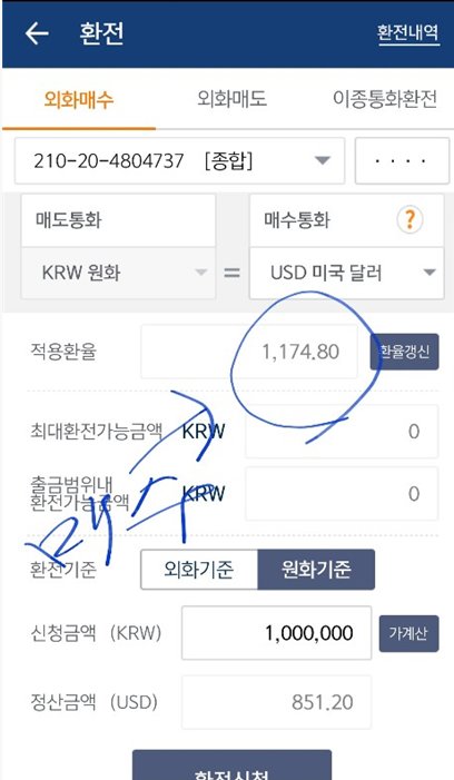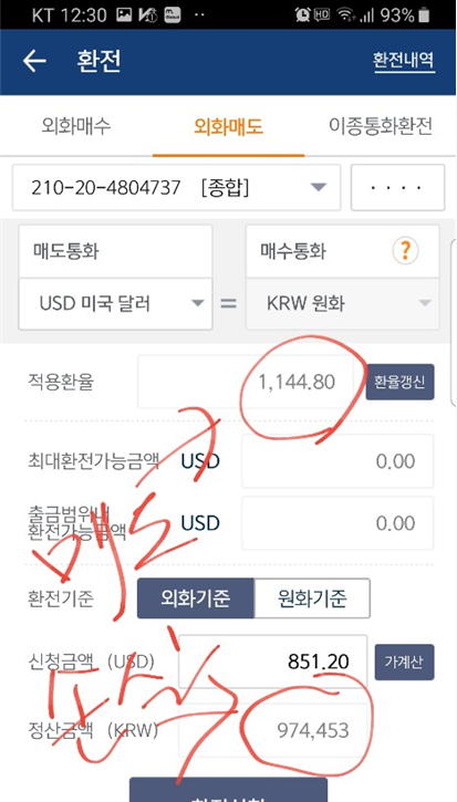 이 851.2 $ 를 바로 원화로 환전을 하려면 1,148.8 원의 적은 환율로 적용이 되어 97만 4천 원을 수령하게 됩니다.