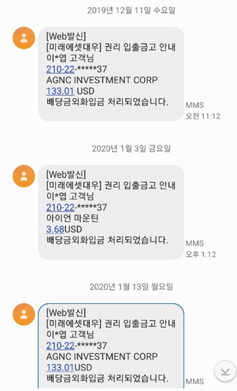 19년 5월 정도 되니 AGNC의 월배당을 바탕으로 평균 17만 원가량 배당금이 지급되었습니다.