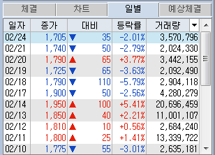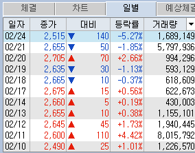 2. 웅진씽크빅 : 4.25일 유상감자 4,925원 공시에 따른 2,800원 정도 지지할 것을 예상, 금일 낙폭 5% 이상으로 매수