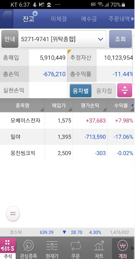 제 계좌는 서브 계좌로 모베이스 100주 30% 수익남은 걸 팔지 못하고, 그냥 물 타서 모베이스 사 버렸네요.