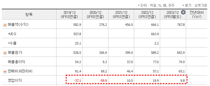 ◐ 시총 : 616 억 ◐ PER : 639 ◐ PBR : 1.6 ◐ 부채율 : 247 % ◐ 배당 : - ◐ 이익잉여금 : - 71 억