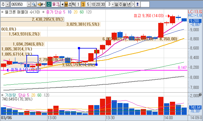 30분간 지속적인 거래량이 계속되다가, 또 3분 봉 20일선을 잡고서 급등하였습니다.