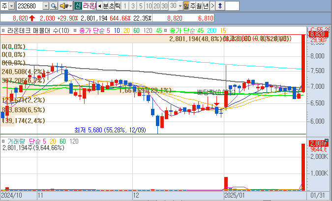 라온테크의 주가가 강세다. 이는 량원펑 딥시크 CEO가 리창 중국 총리와 만나 "중국 내 반도체 산업의 자립화가 시급하다"고 강조한 영향으로 풀이된다. 중국은 미국의 반도체 대중수출 규제에