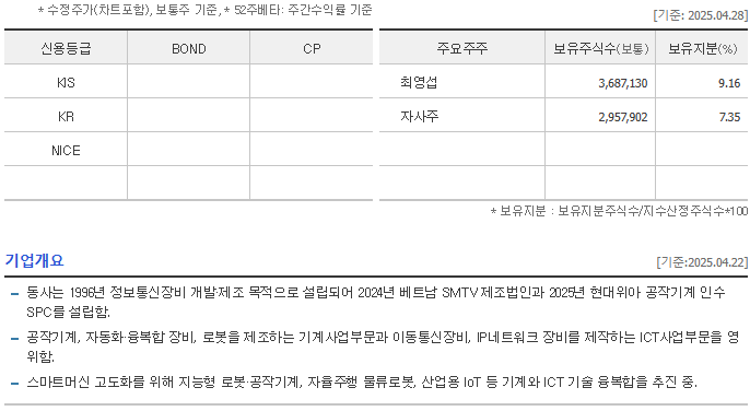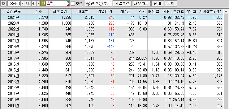 ◐ 시총 : 1119 억 ◐ PER : 5 ◐ PBR : 0.7 ◐ 부채율 : 132 % ◐ 배당 : - ◐ 이익잉여금 : 44 억