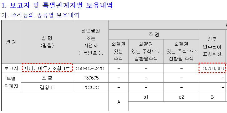 - 신주인수권 장외 --> 제이케이투자조합1호 [ 조철 : 김영미 / 50.1:49.9 ]