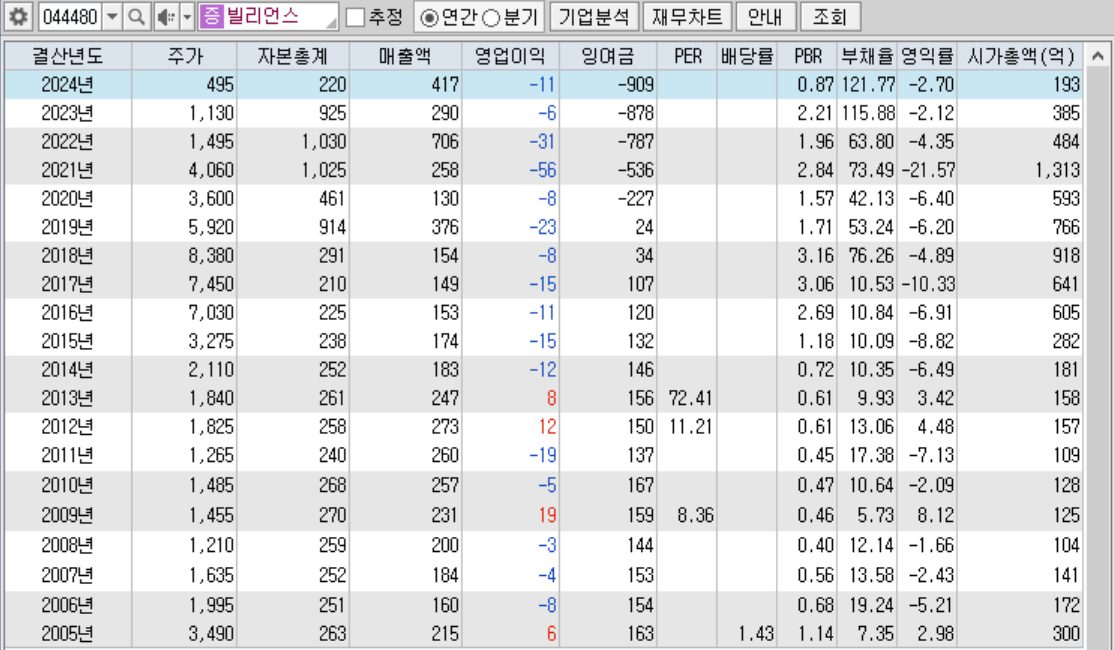 ◐ 시총 : 130억 ◐ PER : - ◐ PBR : 0.6 ◐ 부채율 : 121 % ◐ 배당 : - ◐ 이익잉여금 : - 909 억
