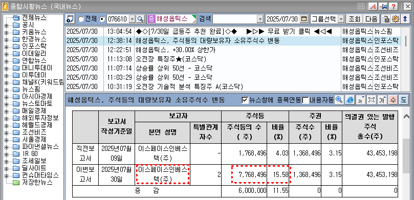이스페이스인베스트텍(주) 대량보유자 소유주식수 변동 이슈가 있습니다.
