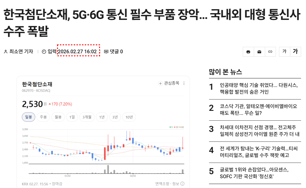 한국첨단소재, 5G·6G 통신 필수 부품 장악… 국내외 대형 통신사 수주 폭발 - 핀포인트뉴스