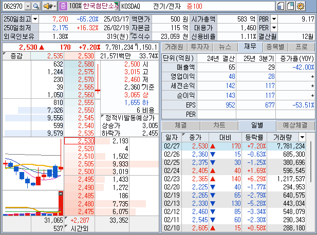 【 한국첨단소재 】 Ⅰ. 요 약 ◐ 시총 : 640억 ◐ PER : - ◐ PBR : 10 ◐ 부채율 : 477 % ◐ 배당 : - ◐ 이익잉여금 : -249 억 [최대주주 및 특수관계인 지분]Ⅱ. 일봉차트 매출현황[ 주봉 2년 ][ 일봉 3개