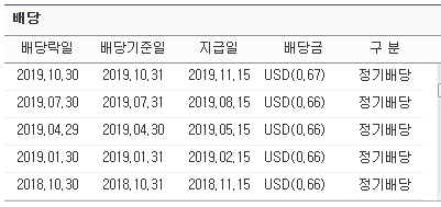 금일[20.04.27] 기준으로는 1주당 0.67달러니 분기배당 2.5%, 연배당 10% 정도 나옵니다.