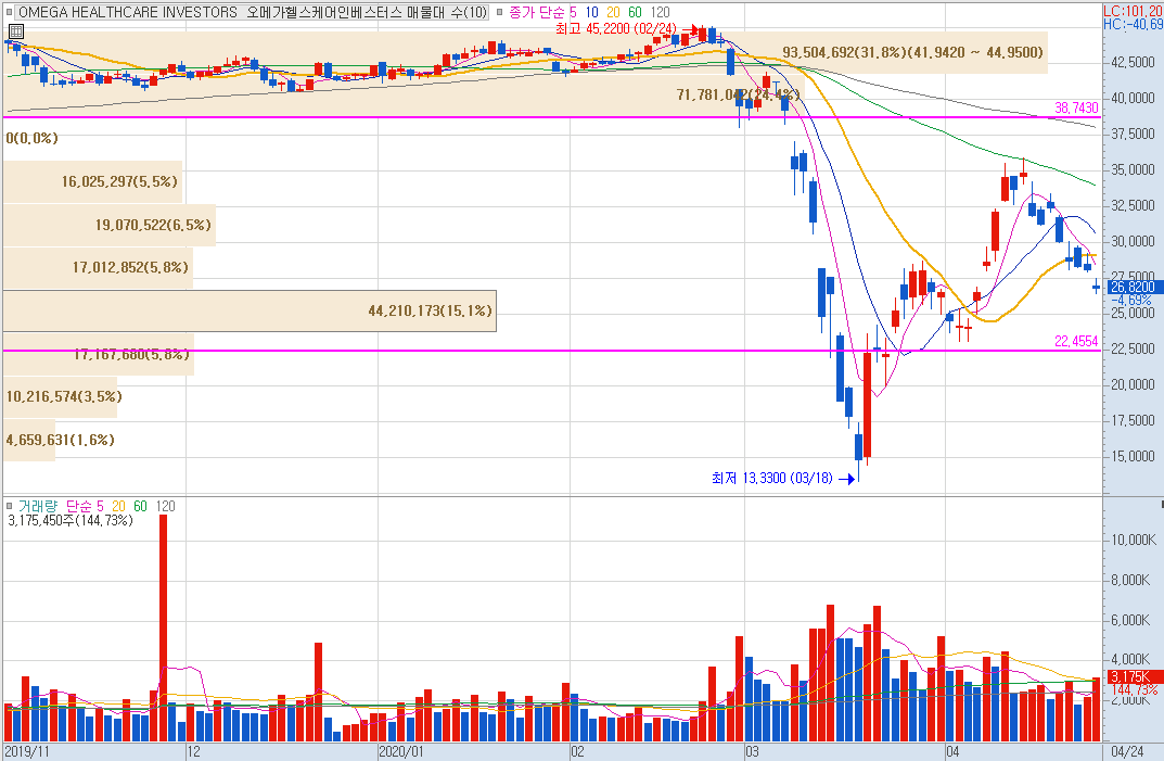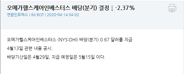 그중 OHI 같은 종목은 배당락 근처에서 소량씩 매입하여, 물리면 추가 물타기를 하여 배당을 받는 전략을 사용하기 좋습니다.