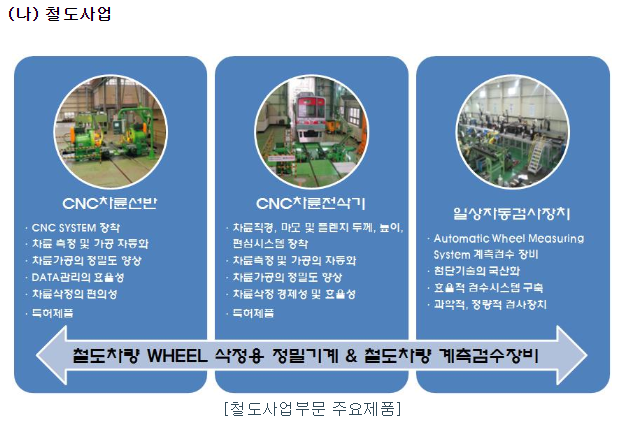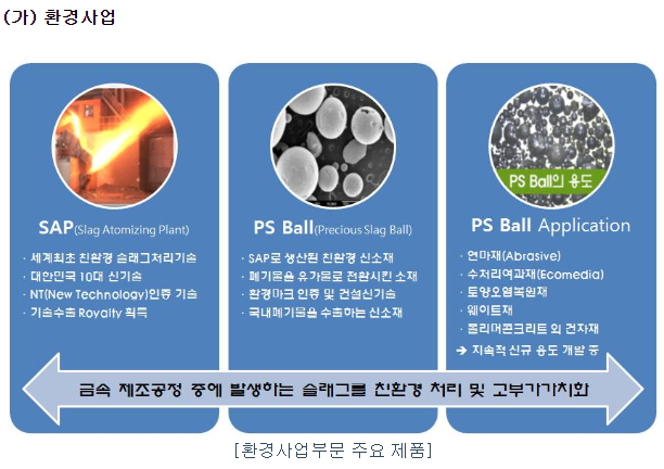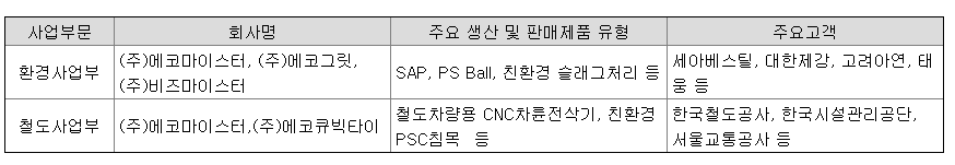 금속 제조공정에서 발생하는 슬래그를 재활용하는 환경사업과 철도사업부는 철도차량 유지 보수하는 철도사업을 영위하고 있음.