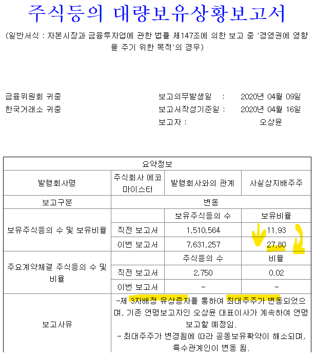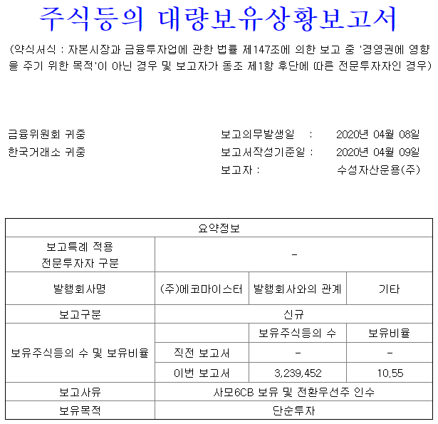 4.08 일 10% 투자회사에서 대량보유 사항이 발생했습니다. [ 아마 3자 유증으로 사모펀드가 들어온 듯합니다 ]