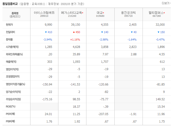 코로나19로 반사이익이 나도 될 텐데, 개학 연기로 다른 교육 관련주는 상하한을 오르내리는데, 여지없이 오를 땐 반영이 안 되고 내릴 땐 함께 합니다.