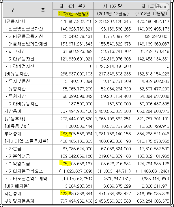부채율이 67%로 10% 정도 감소했고, 부채 500억 보다 자본금이 2배 이상 증가했음