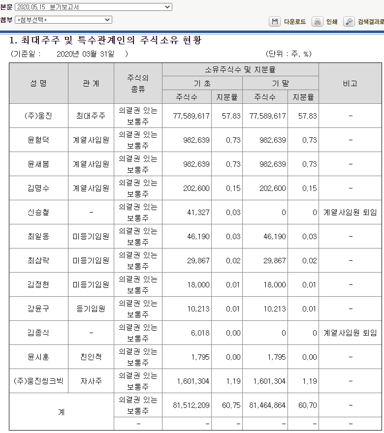 대주주 지분도 35%에서 60% 그중 웅진이 57%로 엄청 늘었습니다.