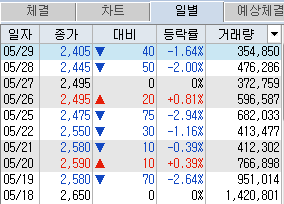 평단은 감자 수량만큼 희석되어 올라가버리고, 배당 공시 번복에 따른 실망감으로 기준가는 감자 전에 2,650원이었던 주가는 보름 남짓 지났는데, -10%가량 흘러내렸습니다.
