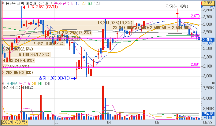 웅진씽크빅은 2천 원 바닥에서 1700원 고점으로 2천4백 원에 있네요.