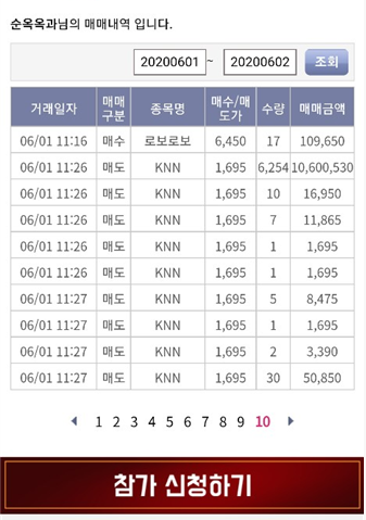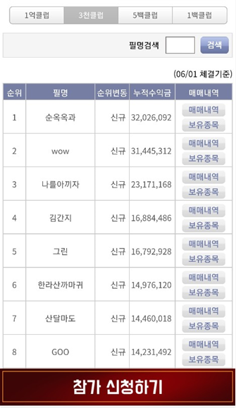 좋은 점인지 나쁜 점인지는 모르겠지만 순위권 사람들의 매매기록을 볼 수 있습니다.