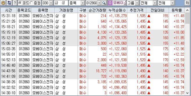 1시 30분부터 힘은 약해졌지만 또 순매수만 30만 주 가격은 1530~ 1450원 사이