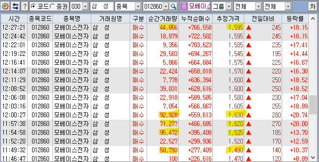 12시 무렵은 50만 주가 1500~1630원 유입되었습니다.