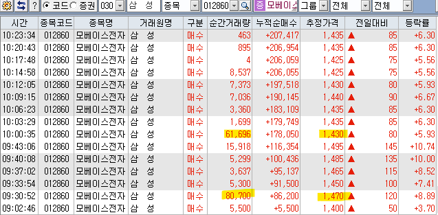 9시 30분 무렵 삼성 창구에서 1470원 8만 주, 1430원 6만 주