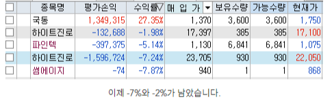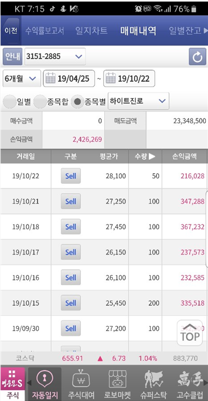 250만 원가량 수익에 배당까지 3년간 250 정도로 합치면 500만 원의 수익을 가져다준 하이트 진로인데, 샘코 단타로 인해 순식간에 까먹고, 웅진싱크빅이 엇박자 매매로 빌빌 데니 이익실현이 조금 색이 바랜 듯합니다.
