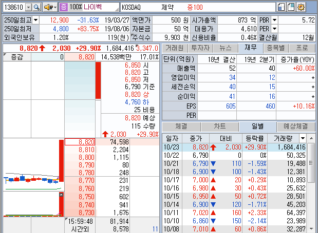올해 나이벡은 파인텍과 함께 별 시리 좋은 주식도 아닌데, 뜬금없는 힘 좋은 주식으로,