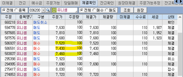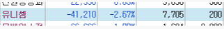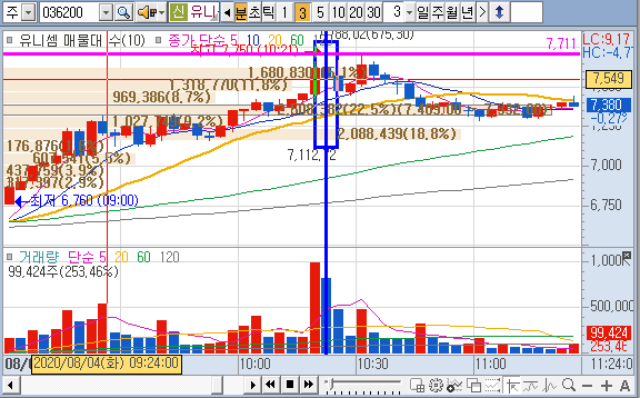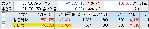 급등을 하던 유니셈은 추후 힘이 빠지면서 평단 7,564원을 위협하더니...