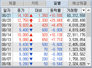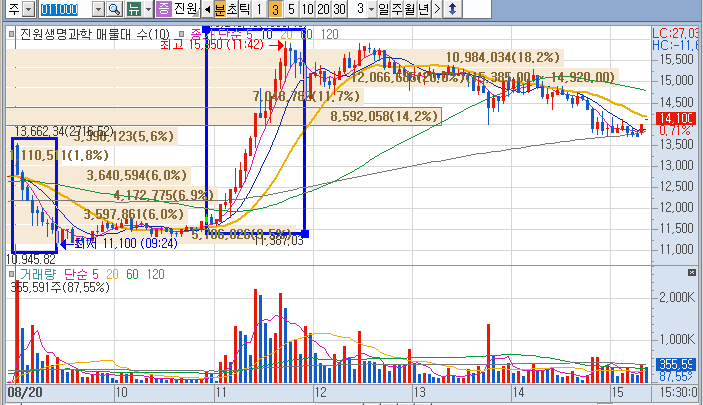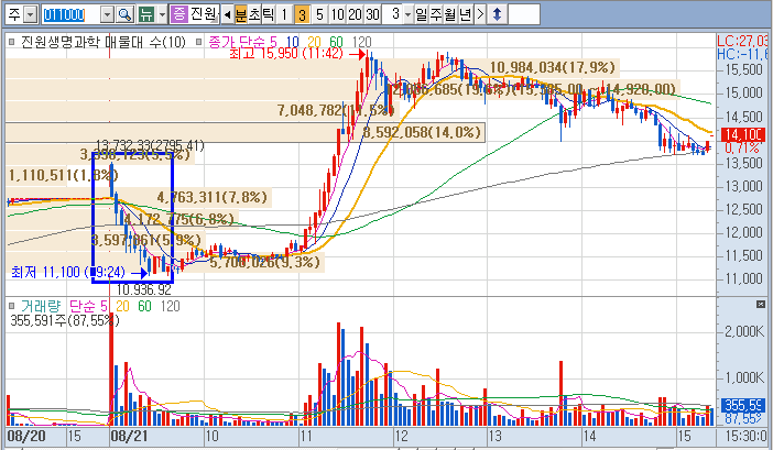 11시부터 대량거래와 함께 저가 대비 30% 오르면서 20%에 안착했습니다.
