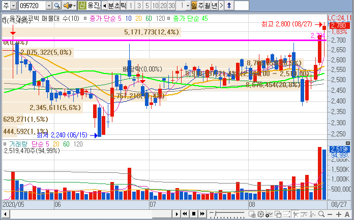 웅씽도 깨졌지만 장후 웅진씽크빅은 거래량을 수반하면서 2700원선을 탈환했습니다.
