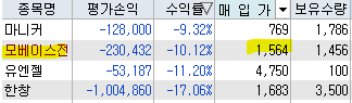 10만 원씩 15번으로 호가창에 나누어 샀는데, -10% 순식간이네요.