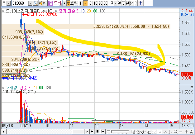서연이 조금 2등주로 밀리는 듯하더니 모베이스 전자가 최근 조금씩 살아났었습니다.