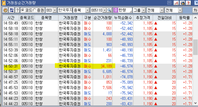 금일 오전장을 보다가 또 자전거래의 낌새가 포착되었습니다.