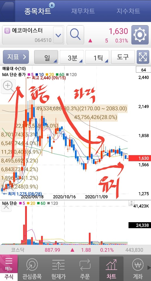 한창 차트와 거의 유사하면서 횡보를 하고 있는 에코마이스터