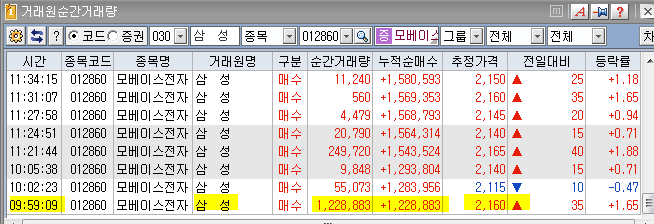 순간 거래량 우위를 보니 9:59분경 123만 주 정도를 매집했네요. 평단 2,160원