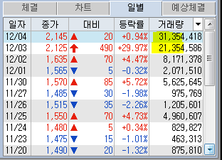 그 이후 어제 21백만 주 30% 상한, 금일은 31백만 주 1%로 마감.