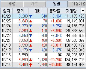 거래량에 흔들릴까 아침장은 그냥 흘려보냈습니다. +1% 정도 보합되더니 결국 -10%로 마감했습니다.