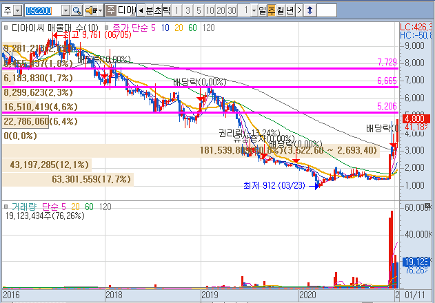 주봉을 보면 3년간 5,200원, 6,600원, 7,700원 등이 보이니