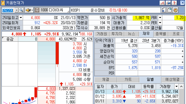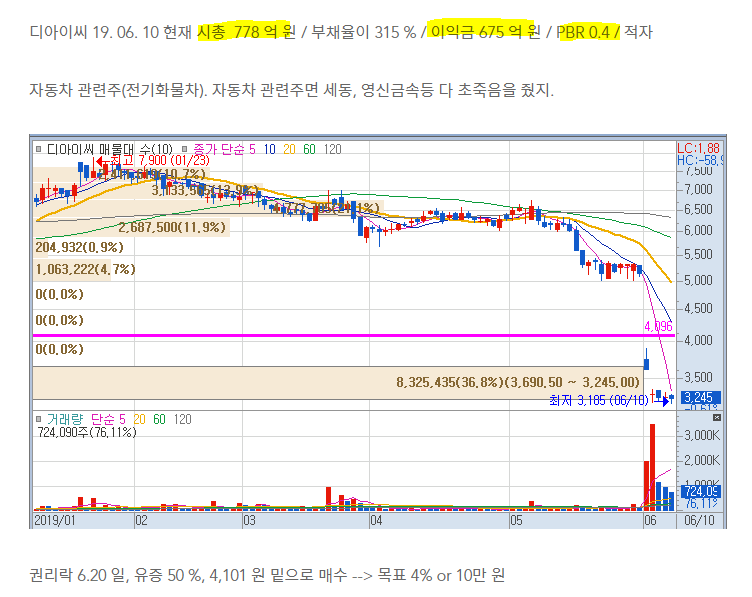 디아이씨 19. 06. 10 현재 시총 778 억 원 / 부채율이 315 % / 이익금 675 억 원 / PBR 0.4 / 적자 자동차 관련주(전기화물차). 자동차 관련주면 세동, 영신금속등 다 초죽음을 줬지. 권리락 6.20 일, 유증 50..
