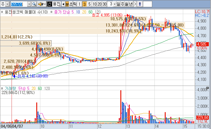 웅진씽크빅 금일 시총이 5,200억원이니 거의 절반의 손바뀜이 있었습니다.