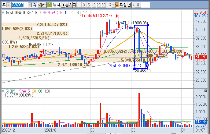 전고점 4,200원도 지켜주었고, 엇그제 최고점 4,500원도 지지를 해 준것에 만족해야 하는 아쉬운 차트긴 합니다.