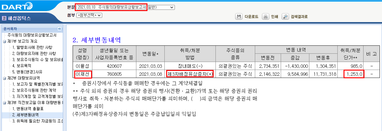 유증 전에 이재선[76년생] 1,253원에 120억 원 3자 배정