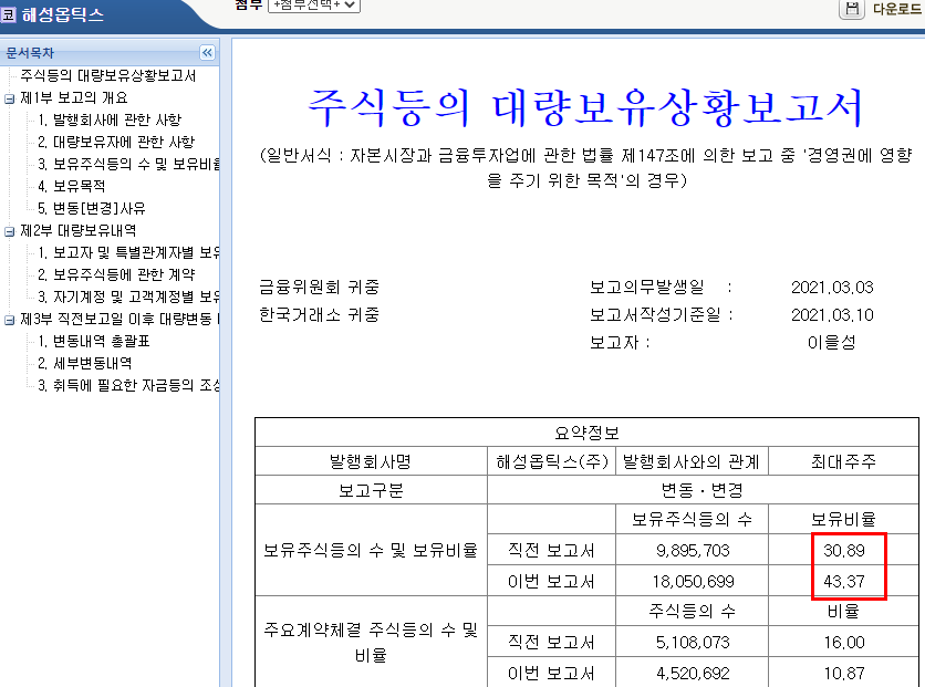 대주주 비율 31% -> 44%로 변경