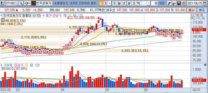 한국금융지주는 모두다 알고 있듯이 카카오뱅크 수혜주로 전에 모으다가 최근 떨어져서 다시 모으고 있는데, 금일 의미 있는 반격이 시작되었네요.