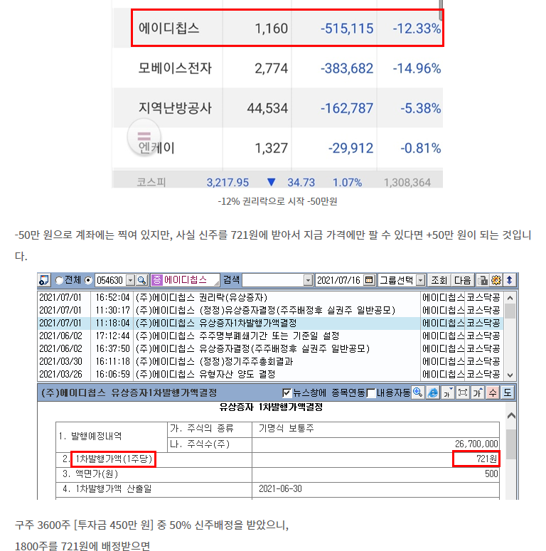 2021.07.16 - [재테크/나만의 주식 매매 방법] - 33-1. 유상증자 권리락 이후 구주 매매 전략 [ 에이디칩스 성공]
