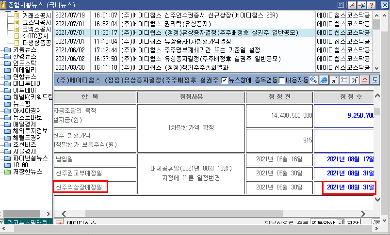 신주 상장 예정일이 8.31일입니다.