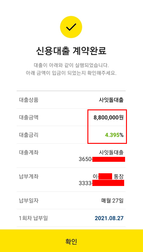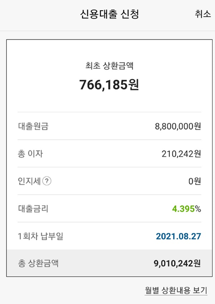 880만 원 1년간 빌렸을 때 총이자금액은 21만 원입니다.