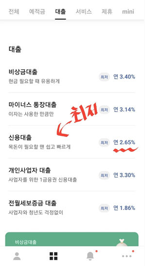 최저 이율 클릭 -> 나의 한도 조회 -> 대출 심사