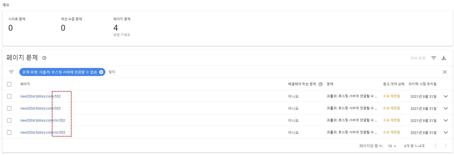 구글 서치콘솔에서 문제가 된사이트를 검색해 봅니다.